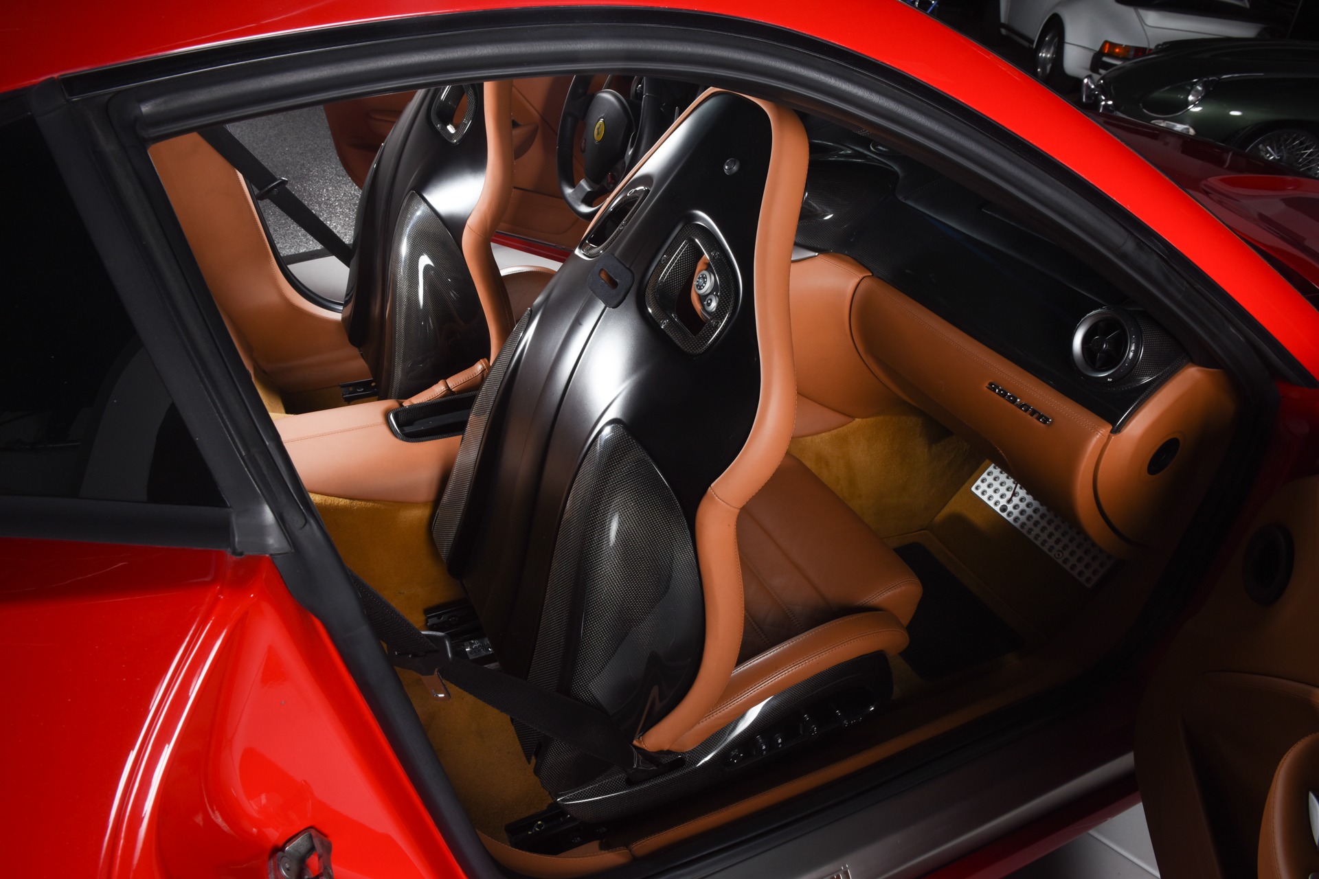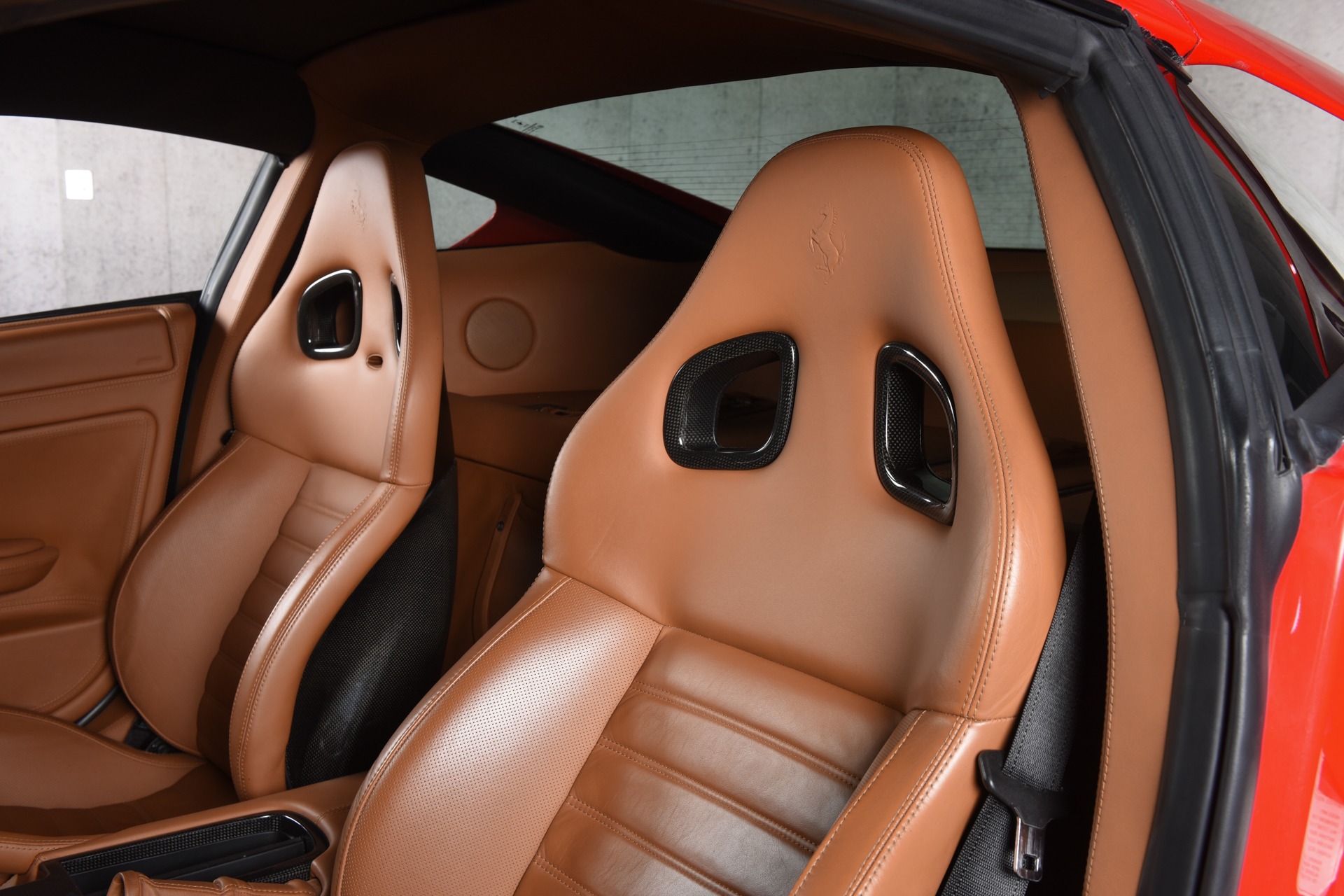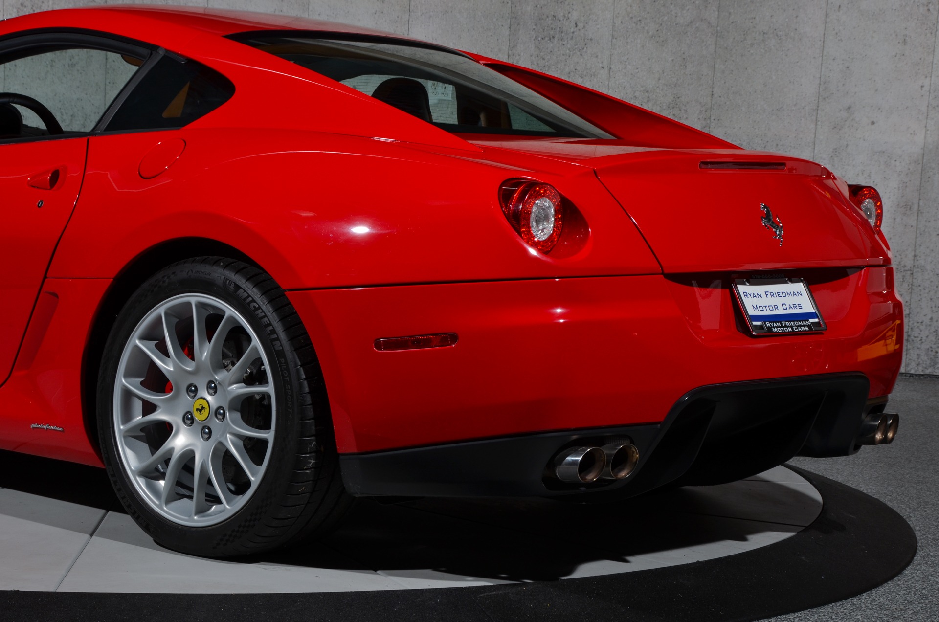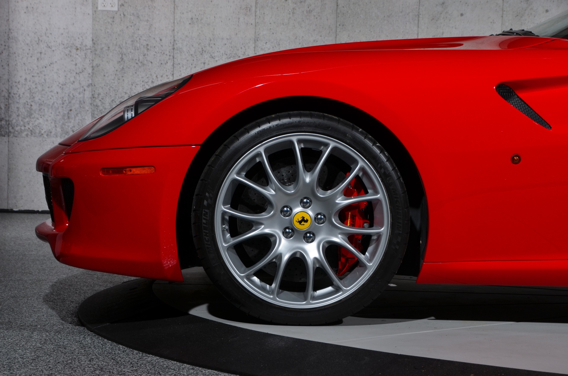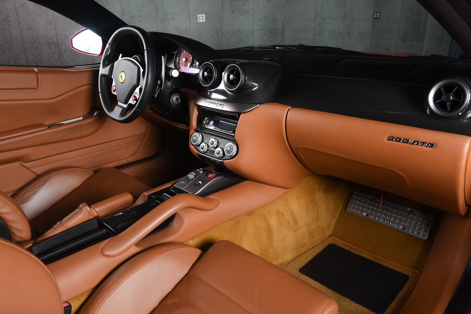 2007 Ferrari 599 GTB F1: Delectably cosseted in the marque's exalted red hue of Rosso Corsa, a hue that sultry showcases the 599's "deliberate-downforce-delivering" and staggeringly sensual encompassing visual motif which aesthetically and purposefully flexes its aerodynamic muscularity while showcased on Monolithic rims wheels in a bright-finish which allows for the red brake calipers bearing black "Ferrari" and the front calipers yellow "brembo carbon ceramic" insignia to lucidly peek through with an elegantly ergonomic and aesthetically attentive cabin surfaced in supple and flattering Natural Brown Poltrona Frau leather and accented by a generous supply of high-gloss Carbon Fiber surfacing which can be seen on the shells and lower section of the all-size encompassing racing seats along with the top of the central console and dashboard regions.