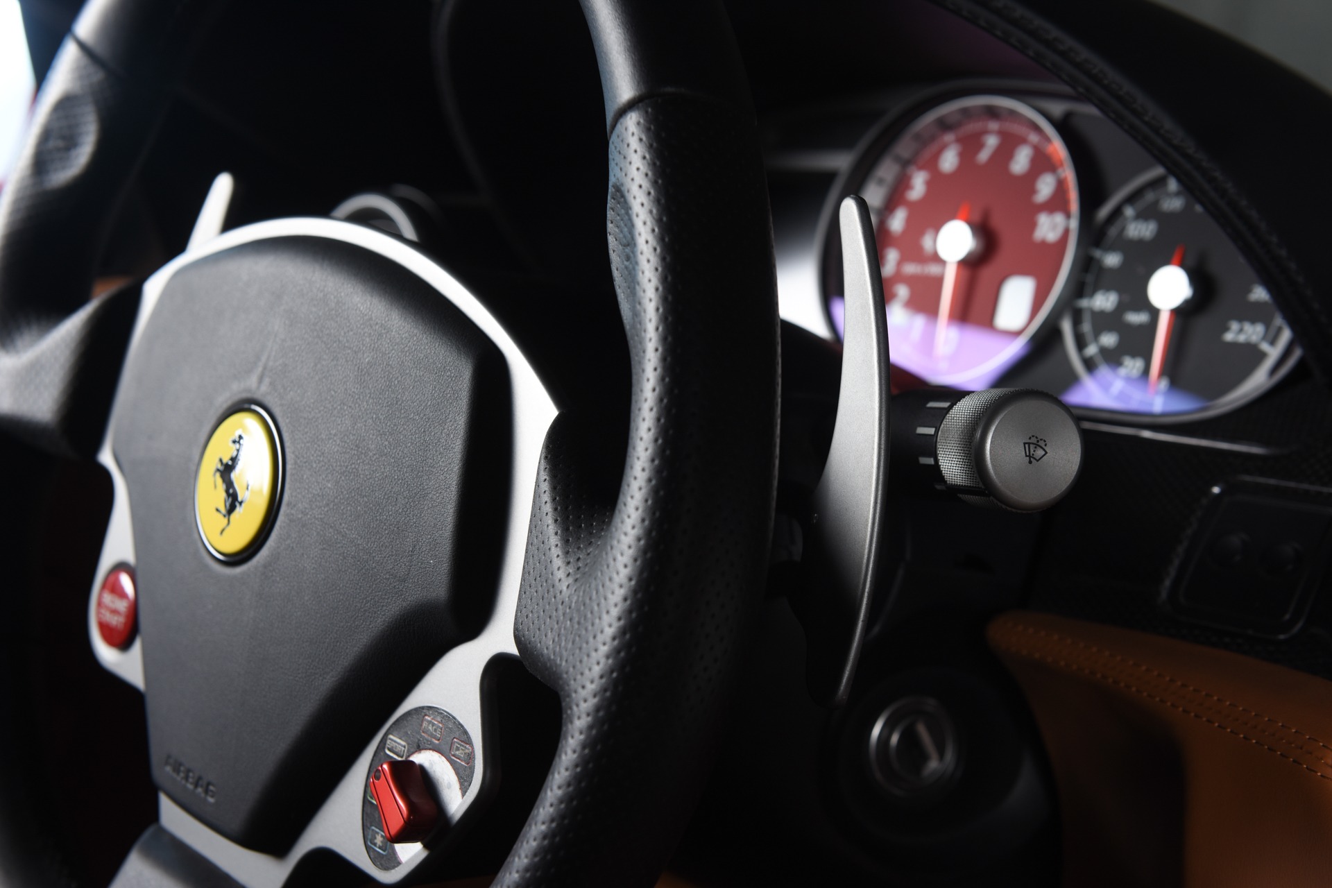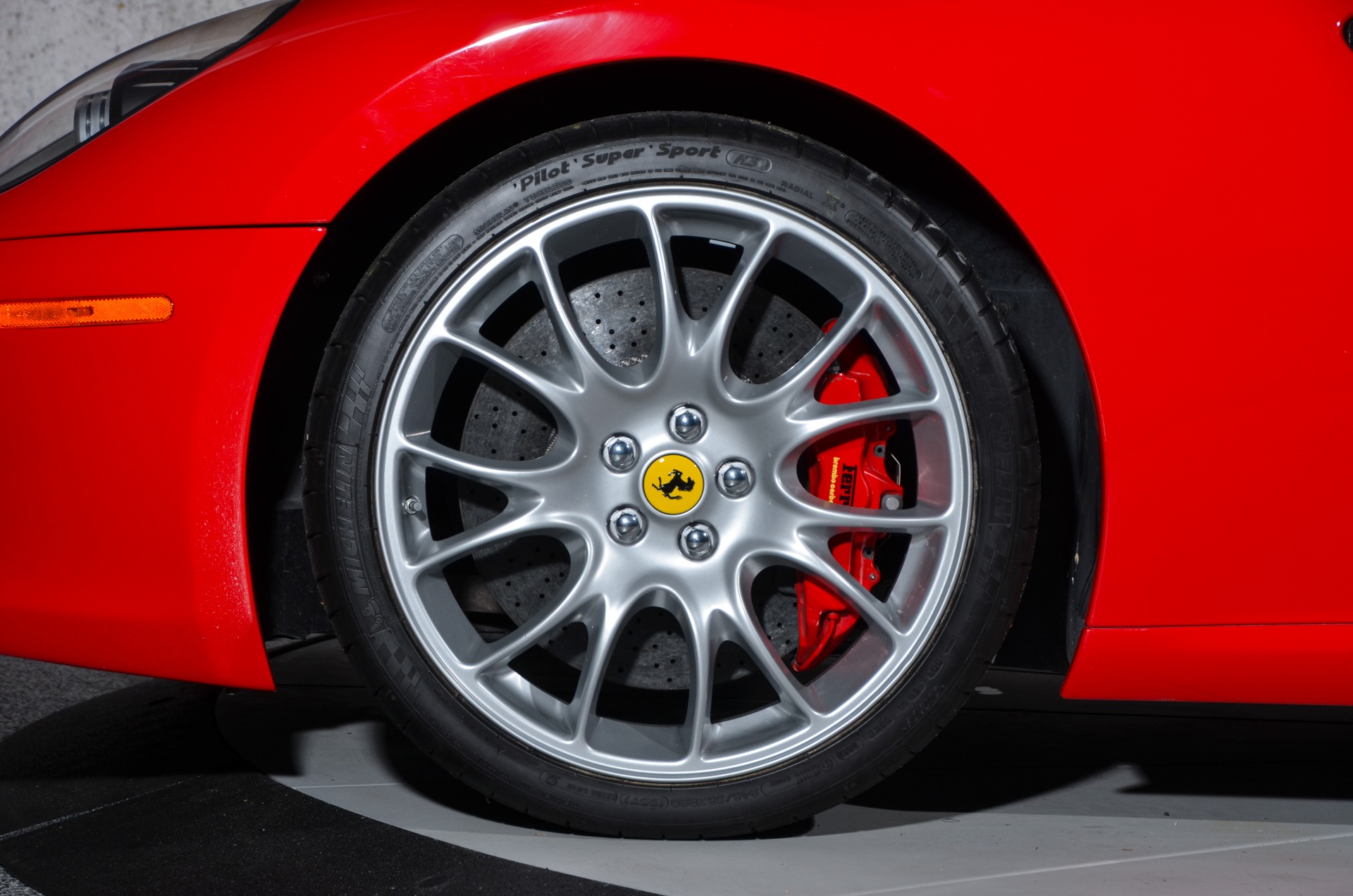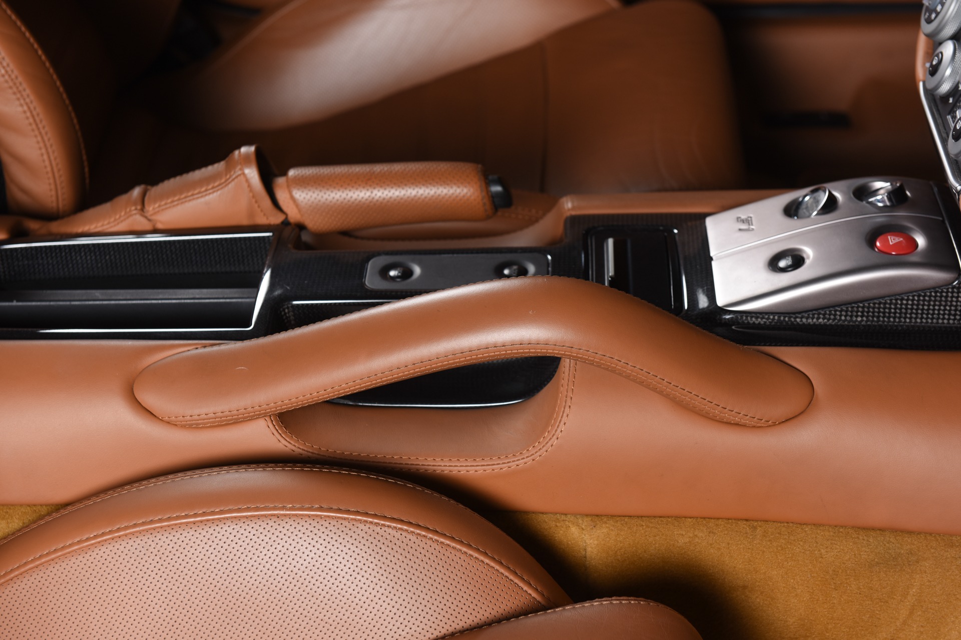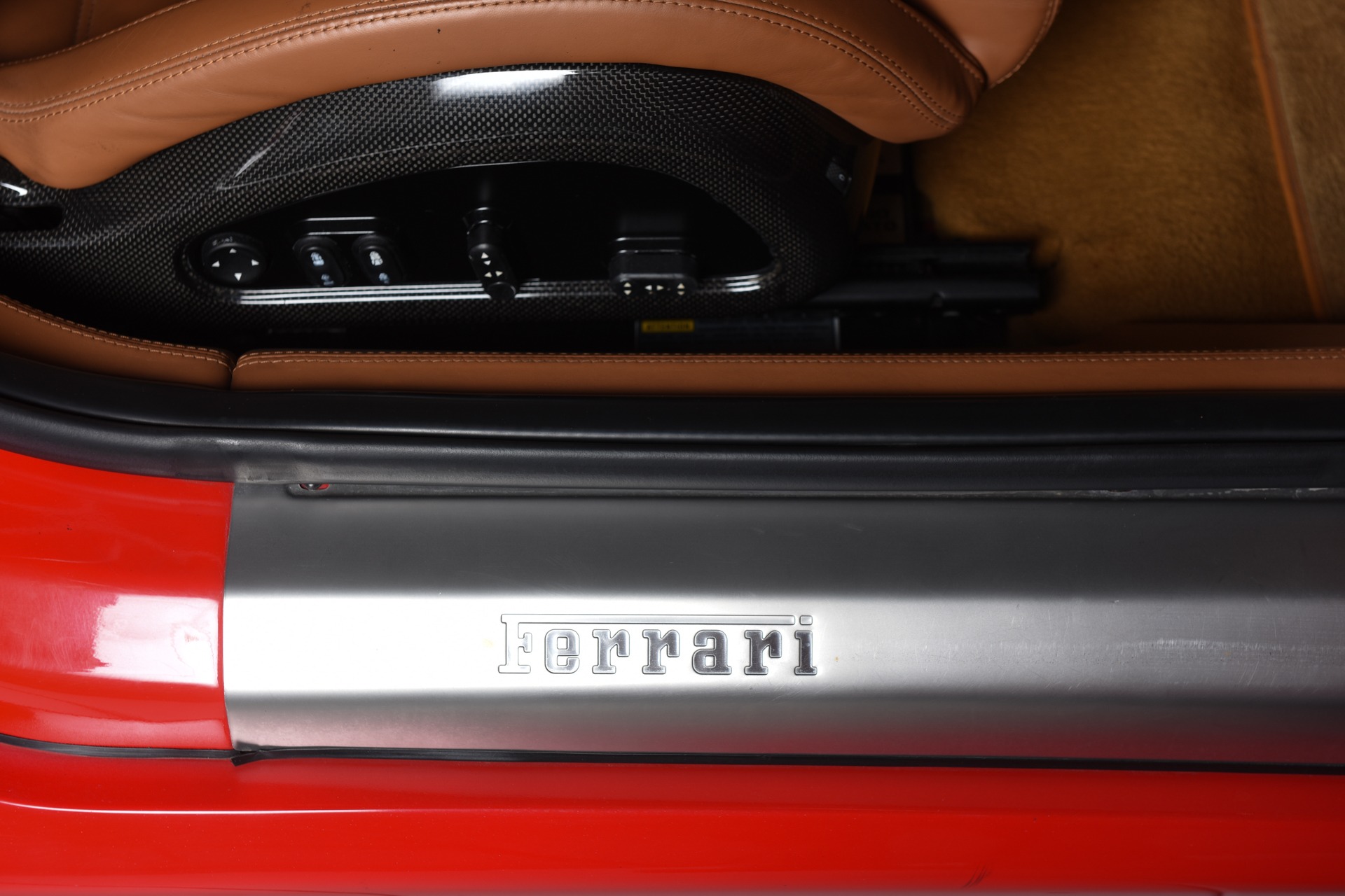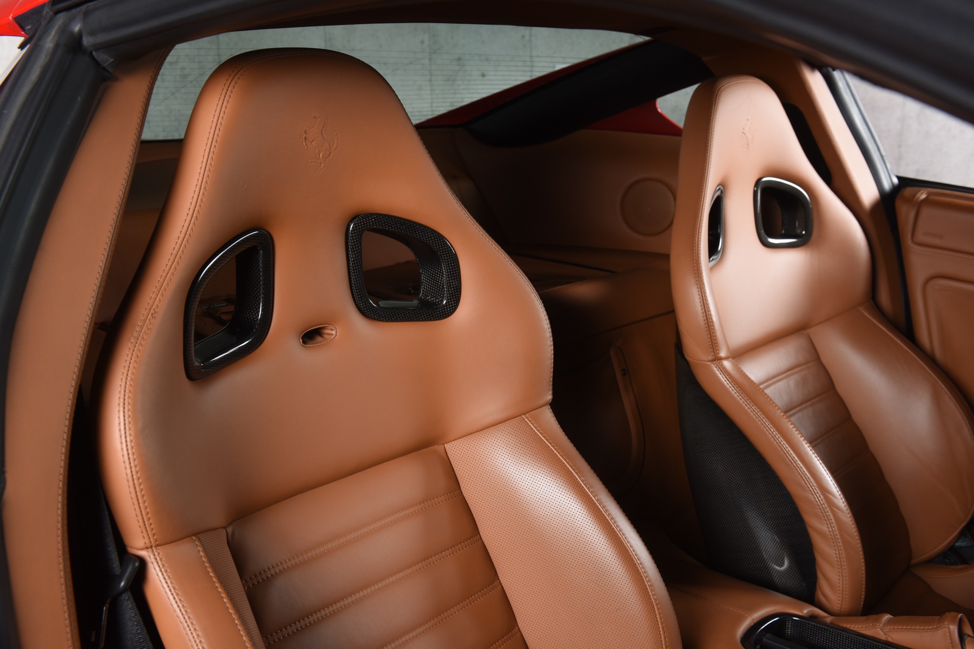 2007 Ferrari 599 GTB F1: Delectably cosseted in the marque's exalted red hue of Rosso Corsa, a hue that sultry showcases the 599's "deliberate-downforce-delivering" and staggeringly sensual encompassing visual motif which aesthetically and purposefully flexes its aerodynamic muscularity while showcased on Monolithic rims wheels in a bright-finish which allows for the red brake calipers bearing black "Ferrari" and the front calipers yellow "brembo carbon ceramic" insignia to lucidly peek through with an elegantly ergonomic and aesthetically attentive cabin surfaced in supple and flattering Natural Brown Poltrona Frau leather and accented by a generous supply of high-gloss Carbon Fiber surfacing which can be seen on the shells and lower section of the all-size encompassing racing seats along with the top of the central console and dashboard regions.