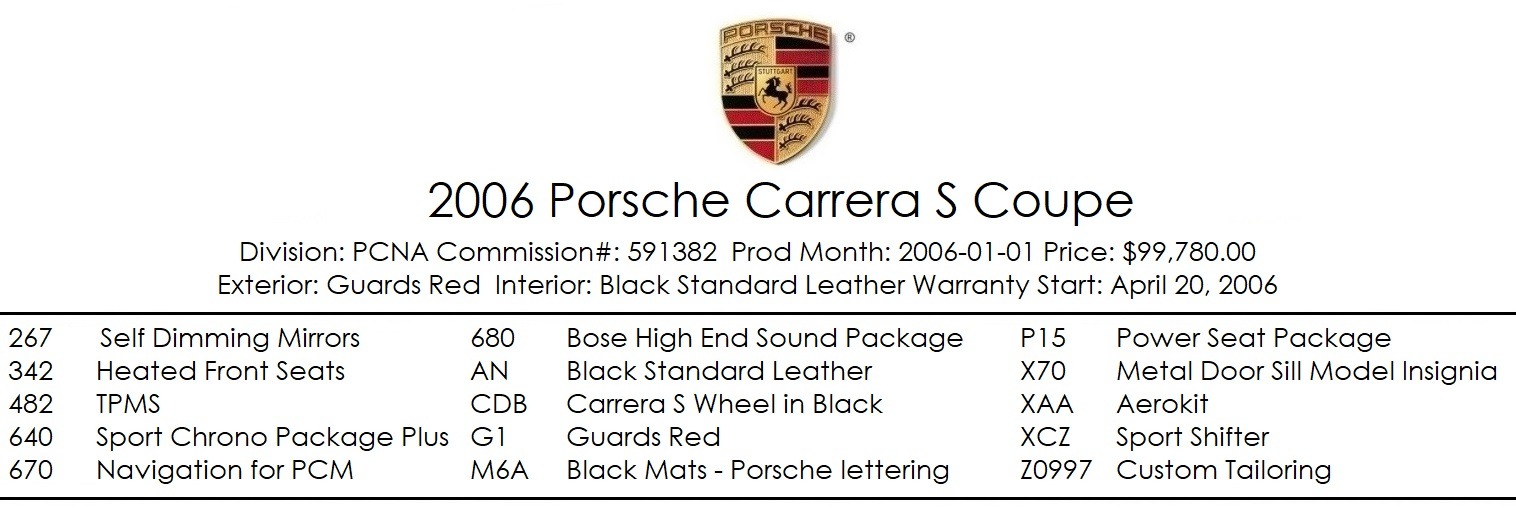 2006 Porsche 911 (997.1) Carrera S 6-Speed Coupe: A modernized yet nearly uninterrupted take on the original, the arrival of the 997 brought back the 911's quintessential design philosophy and being the last 911 generation where electronic driving aids aren't in abundance, the final use of a hydraulic assisted steering system (readily relays roading conditions in the most refreshingly satisfying way) in conjunction with a chassis that boasts enthusiast desirable characteristics (such as the immensely preferable and very apparent "Pendulum Properties", favorable sizing, and a wheelbase that's shorter, just to name a few of this generation's lauded traits) that would no longer be as apparent and/or present in the 911 generation to follow, catapults the 911's 6th generation into contemporary classic status and deservedly so. For an even more stimulating and blissful experience, the S' heighted driving dynamism as provided by its additional horsepower, an exhaust note that's more vocalized and commanding, along with a standard issued PASM system, adds an elevated level of agility, adrenaline and adoration; throw in the intimate connection that transpires between driver and car via the emotive 6-speed transmission, exaltedly amplifies the already superlative driving pleasure that one can expect from the 997.