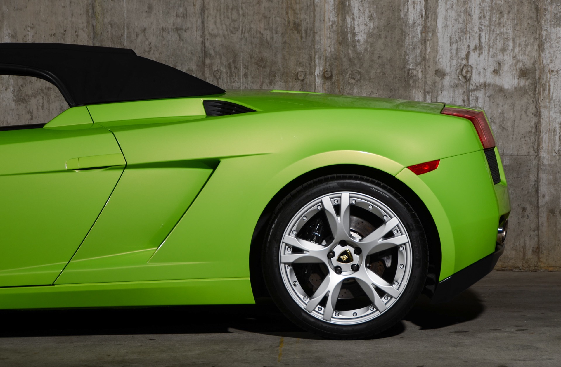 Upon viewing the Spyder's 'where sinuous sensuality meets sharp' aesthetic arrangement, you're audaciously addressed by its championed Verde Ithaca Pearl finish that allows the Spyder to have an elevated exotic factor; the frontend's short overhang motif characterized by an acutely sloping windshield, sweeping, angular-edged headlights positioned just above the bumper's aptly sized air ducts and are set in between the hood's distinguishing dual creases and marque badging, all coming together to create an assertiveness that's extremely expressive; a striking side profile comprised of functional vents and surface areas that tantalizingly transitions from flat, to flush, to fluidic and is further punctuated by the forcefully poised mirrors and the multi-spoke 19-inch Callisto wheels in a titanium-adjacent finish and are showcased before white 'Lamborghini' script bearing black brake calipers; the rear's frontend repeating short overhang concept effectively emphasized by a festive quadrilateral theme consisting of a centrally located rectangular vent with chrome 'Lamborghini' insignia residing overhead and square lighting assemblies stationed right above 'stacked' shape corroborating vents with the lower vents housing bright-finished exhaust tips with the theme continuing onto the multi-vented engine lid which also boasts an automatically deploying spoiler that raises at around 75 MPH and lowers at roughly 54 MPH.