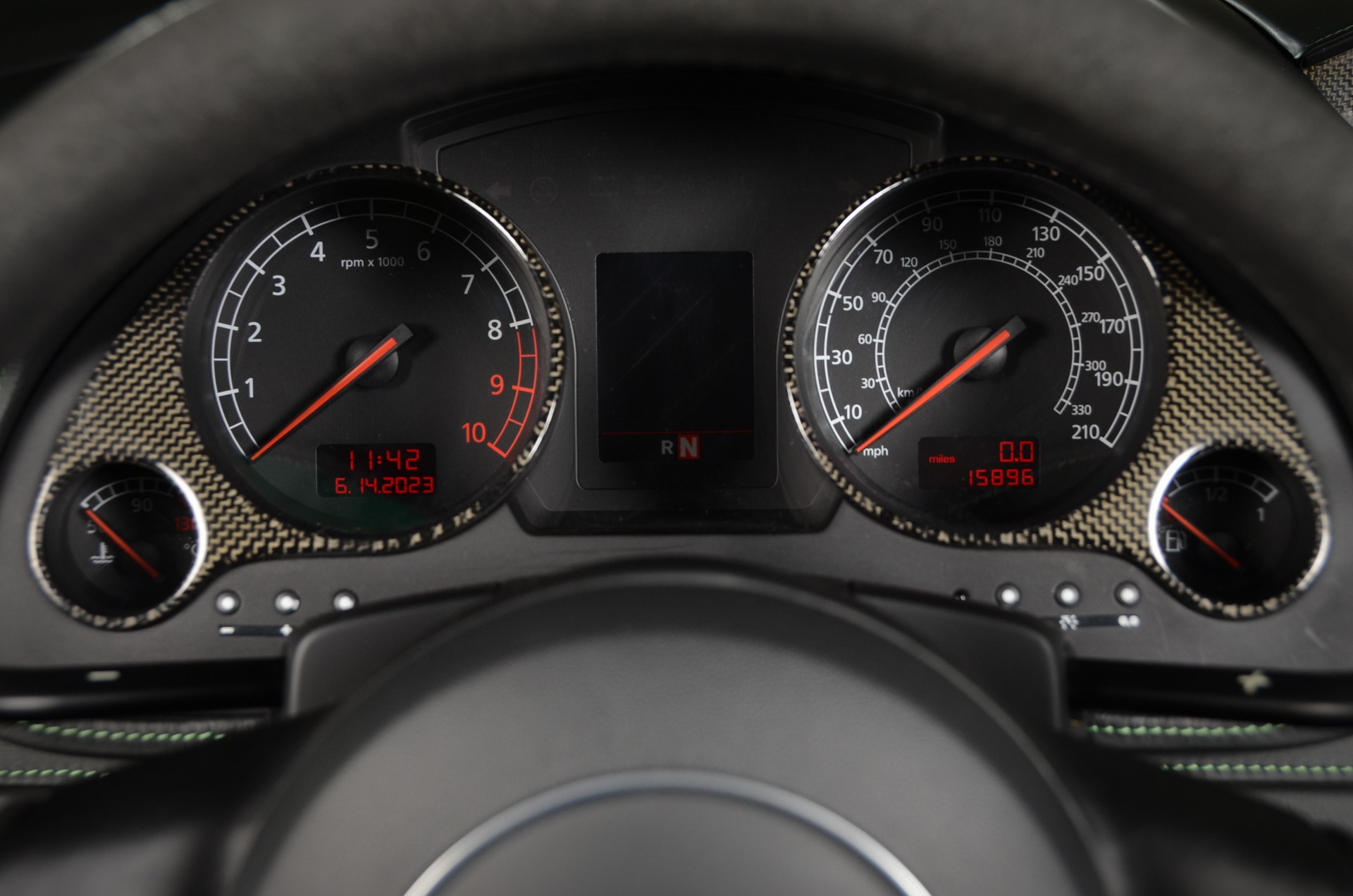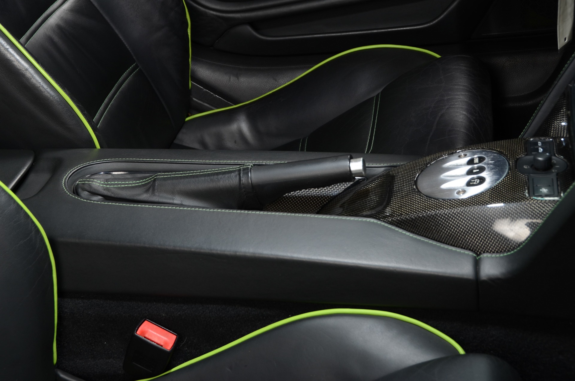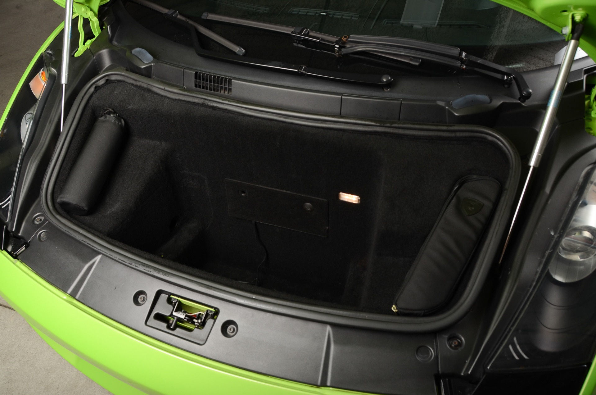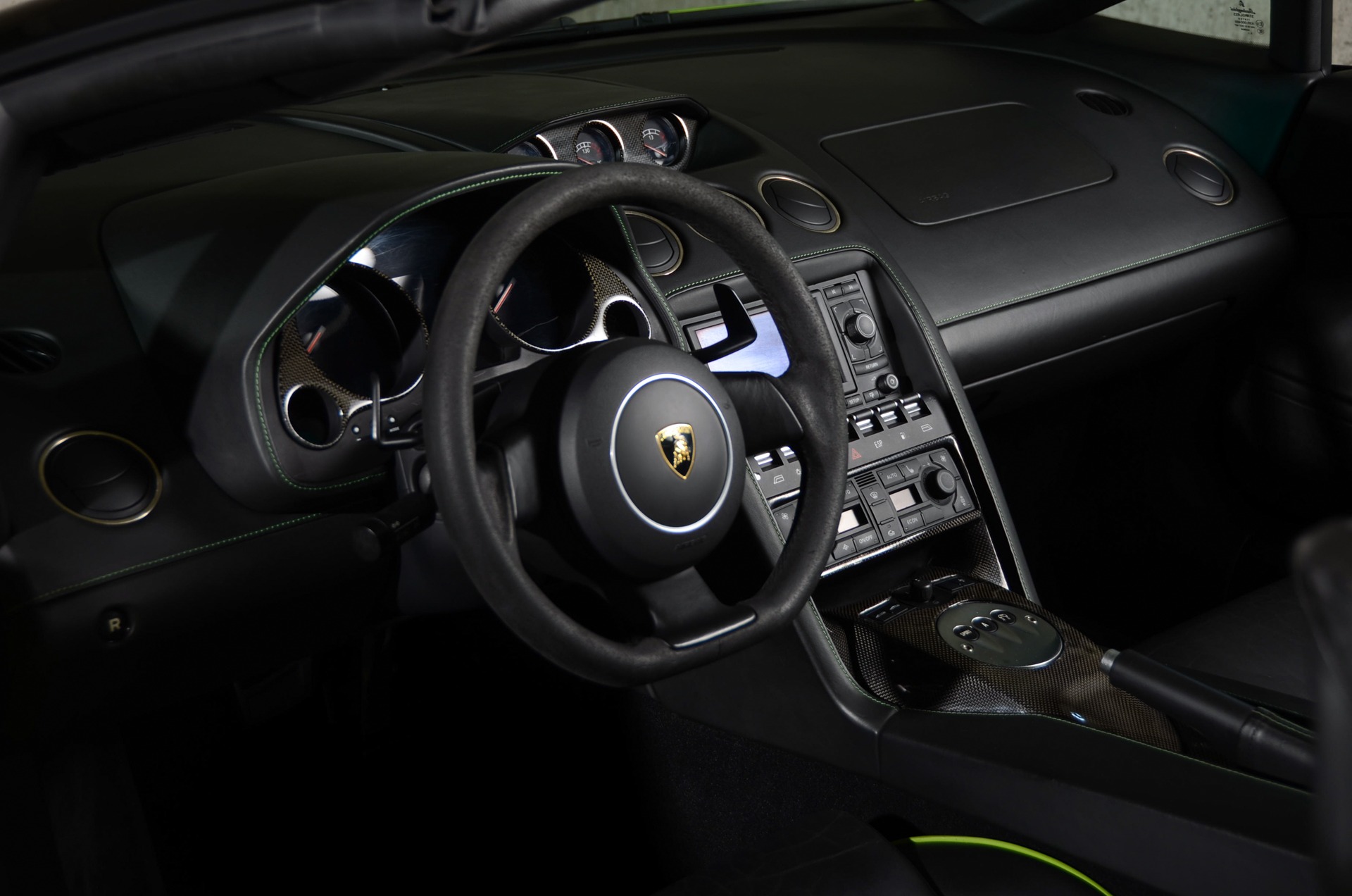 Just before slipping inside of its onward flung and hand-crafted leather lined cabin, you're first met by bright-finished sills featuring lightly-finished 'GALLARDO' insignia followed by its all black (Nero Perseus) interior that is visually heighted by green stitching and piping, and Carbon Fiber trim on select areas. The driver is greeted by a 3-spoke-suede-wrapped and flat-bottom steering wheel which sits before the column mounted E-Gear shift paddles; black instrumentation dials accented by white numerals and an orange needle with a Carbon Fiber trim surround; an upper dash-mounted gauge pod housing the oil pressure, temperature, and battery readout gauges also bearing a Carbon Fiber finished surround; a 6.5-inch screen which hosts the navigation along with other useful functionalities. Front occupants are embraced by power-adjustable and heated bucket seats and can expect in-cabin audio playback via the standard, 4-Speaker, audio system.